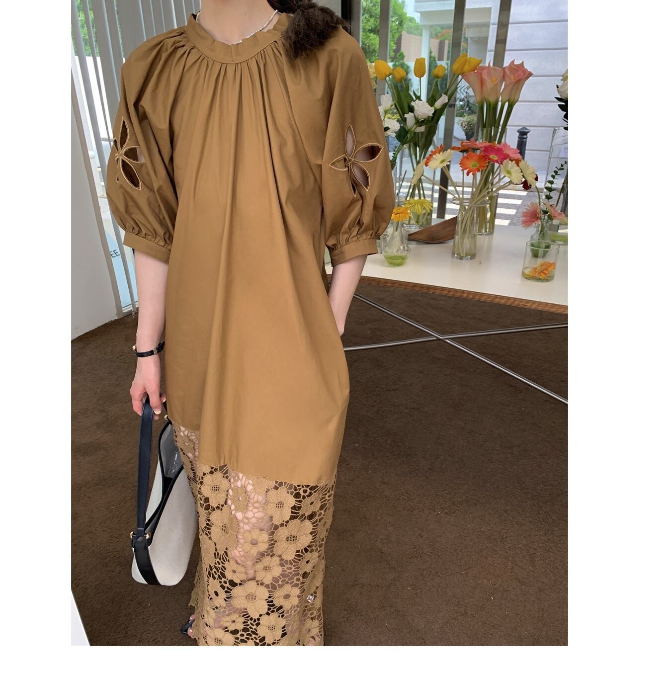 上品なエンブロイダリーレースワンピース。