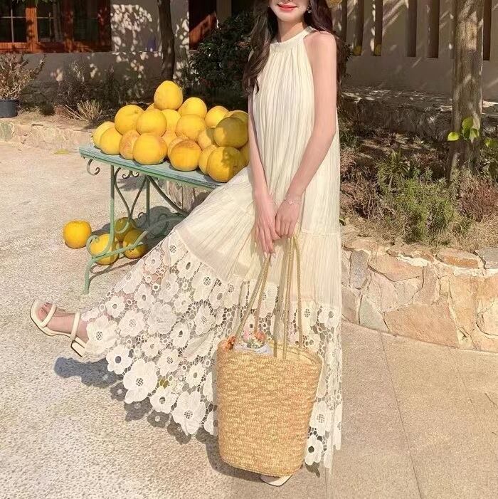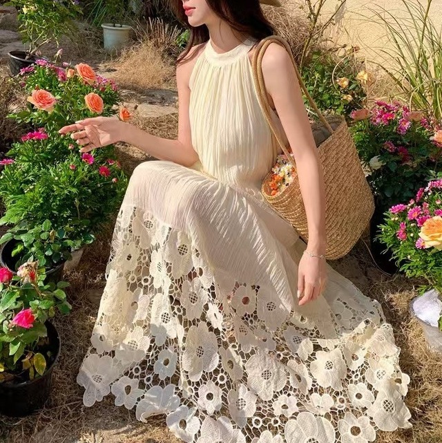 エンブロイダリーレース トリム ワンピース ロング ワンピ きれいめ 涼し気 フラワー レース 花柄 ドレス 大人 おすすめ 可愛い レディース 上品 シンプル リゾート レトロ S M L XL 旅行 IMAGIBUNE 新作 人気 おすすめ 夏 着回し 20代 30代 40代 OP-1599CMY