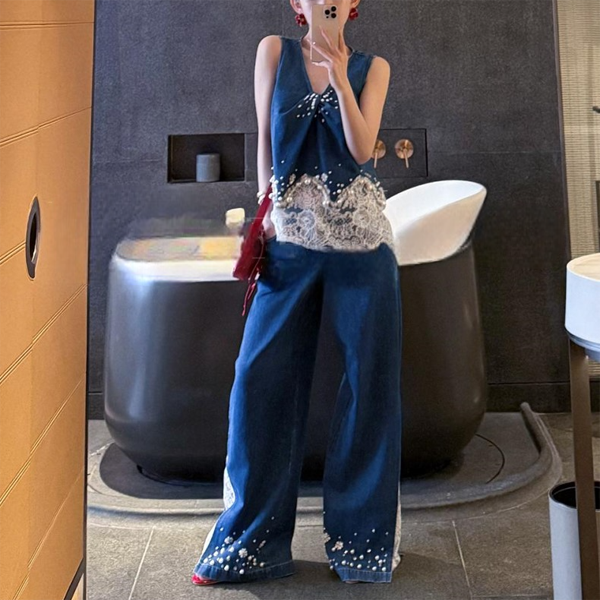 デニムセットアップ セット スーツ ツーピース トップス ノースリーブ ベスト ロングパンツ デニムパンツ カジュアル パンツ ジーンズ パール レース リラックス 春夏秋 お出かけ 普段着 上下セット レディース ヴィンテージ 着回し 20代 30代 40代 50代 ST-1636CMY