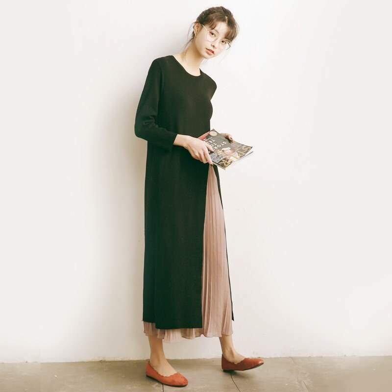 スリットニットワンピースにプリーツスカートがドッキングされたワンピース。