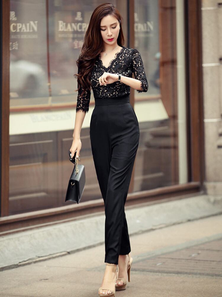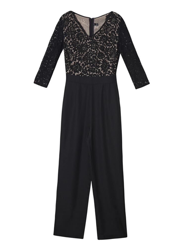 【送料無料】 オールインワン ハイウエスト レース Vネック 半袖 七分袖 ジャンプスーツ ブラック デート 女子会 パーティー 二次会 お呼ばれ AI-001HM