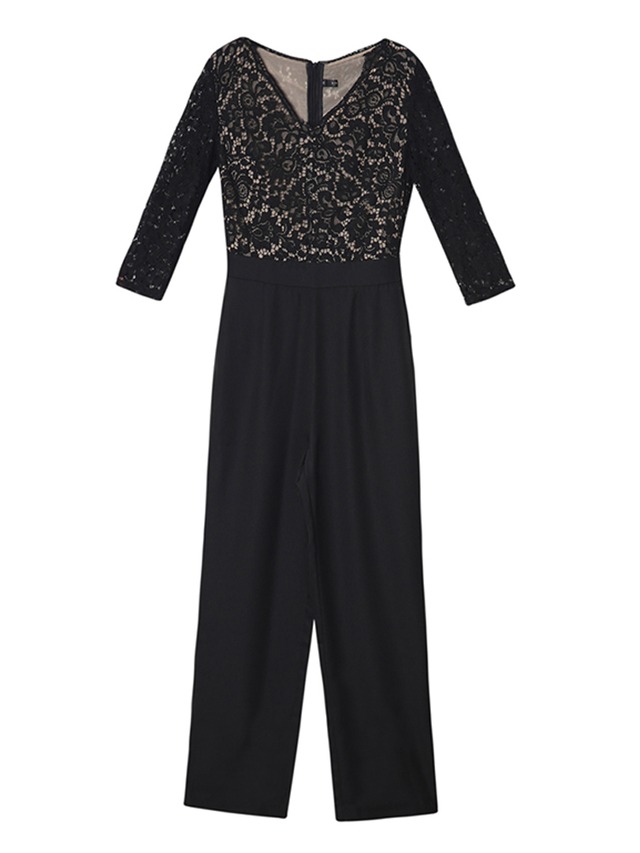Vネックのレースがエレガントなジャンプスーツです♪ハイウエストで脚長効果も抜群♪上品な大人デザインは女子会からパーティー、二次会まで色々なシーンでお使い頂ける一枚です。