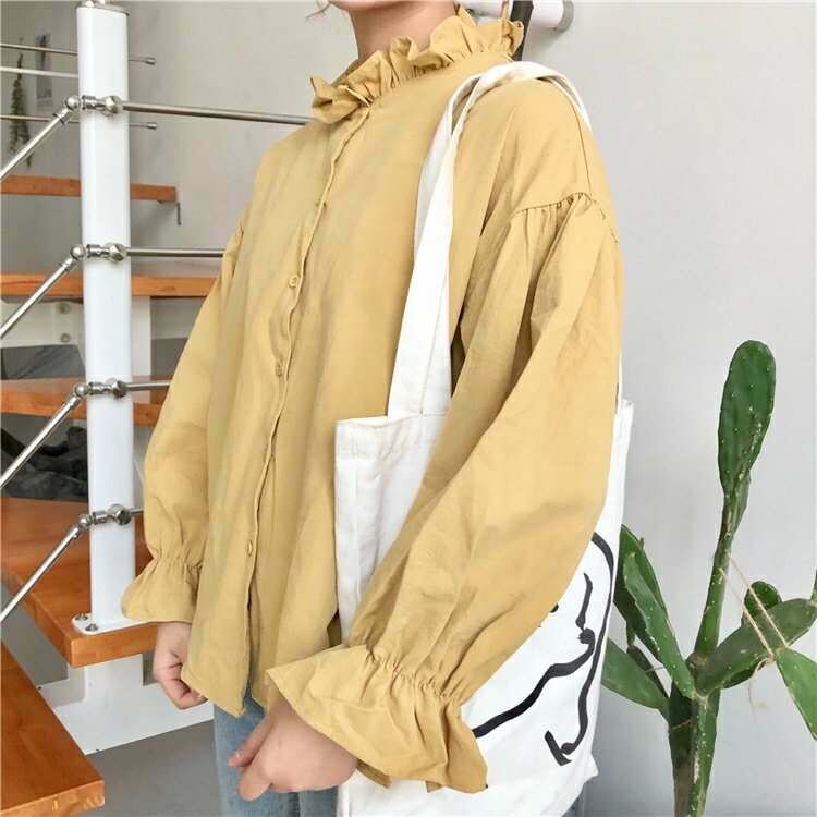 【送料無料】 フリルブラウス バルーン袖 ボタン ドロップショルダー ガーリー TP-009NM