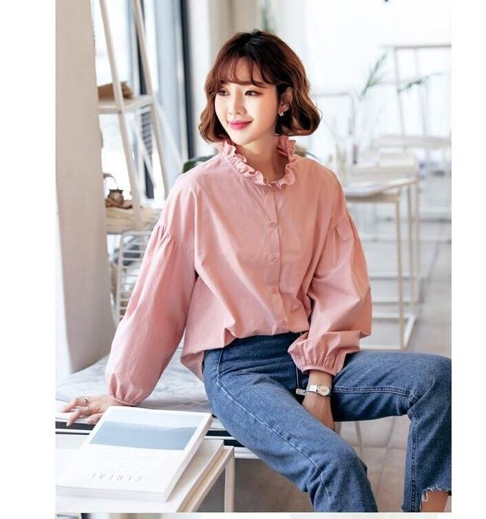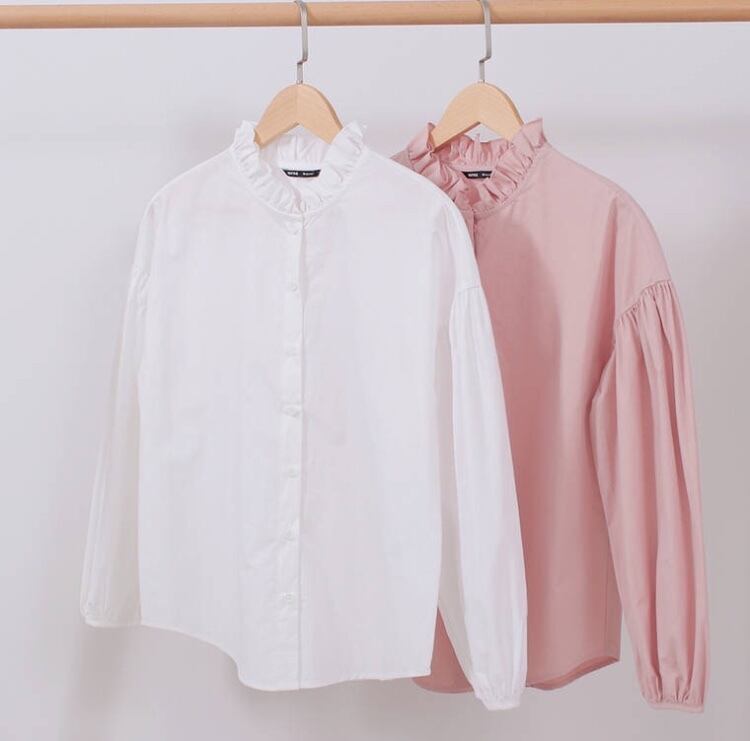 襟元フリルのシンプルシャツブラウス。程よいボリューム袖が女性らしい可愛い印象を与えてくれます♪ハイウエストのボトムスやスカートに裾をインして着るのがおすすめです☆