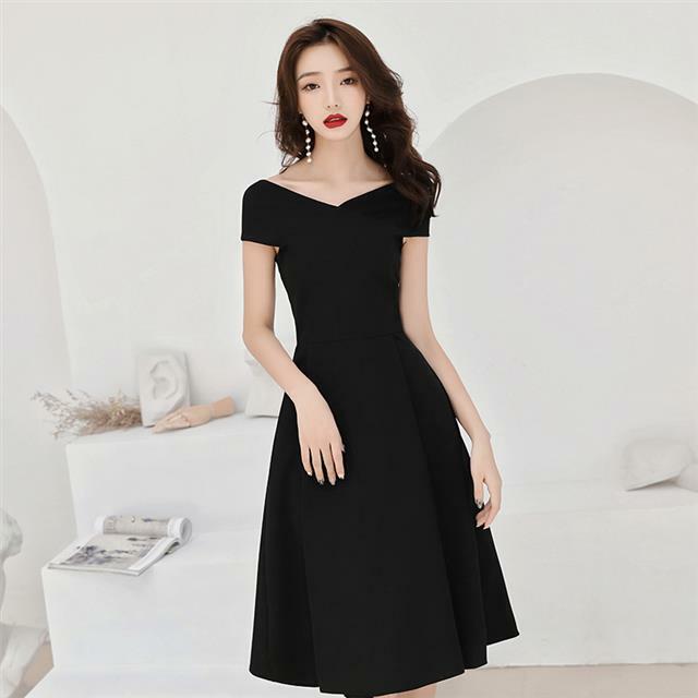 【送料無料】 Vネックワンピース パーティードレス ひざ丈 半袖ワンピ フレア Aライン バックシャン ブラック シンプル 大人可愛い パーティー 女子会 二次会 お呼ばれ 結婚式 DR-010HM