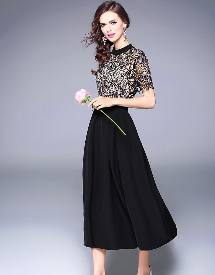 【送料無料】 パーティードレス 透かし ギュピュールレース 半袖 ラウンドネック スタンドカラー ウエスト切り替え ブラック Aライン フレアスカート 上品 フェミニン 結婚式 二次会 発表会 デート DR-001KW