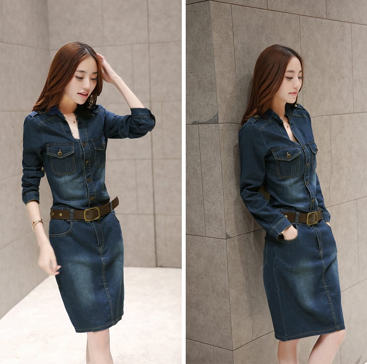 【送料無料】 デニムワンピース 胸ポケット 立ち襟Vスキッパー 長袖 ミディ丈 タイトスカート ハイセンス シティー派お洒落 オフィス 普段使い アフターファイブ 大人フェミニン OP-001KW