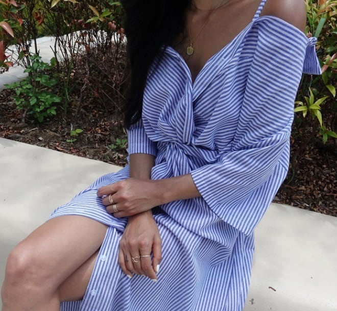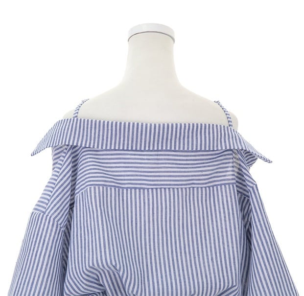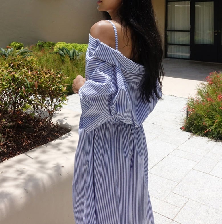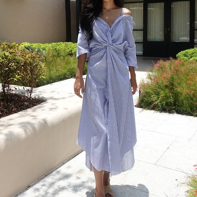 【送料無料】 オフショルダー 七分袖 ワンピース 肩出し ストラップ ブルーストライプ 肩見せ フェミニン カシュクール サマーワンピ リゾート 夏 フィッシュテール OP-102HM
