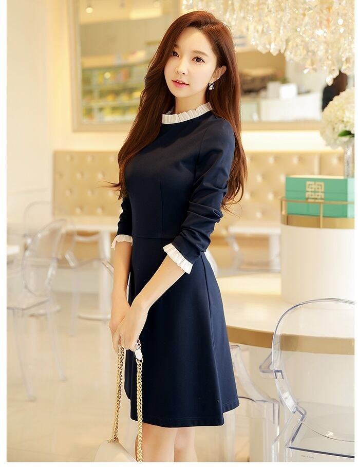 【送料無料】 ワンピース 長袖 ミドル丈スカート スリムウエスト ネイビー OP-006KY
