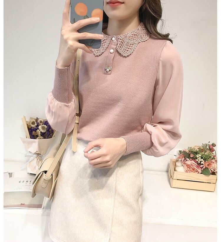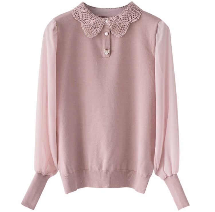 シフォン素材で薄っすらと透ける袖が可愛いブラウス。襟元のレースとパールボタンに付いたリボンのチャームがアクセント☆落ち着いたデザインなのでオフィスでも着れちゃいます。