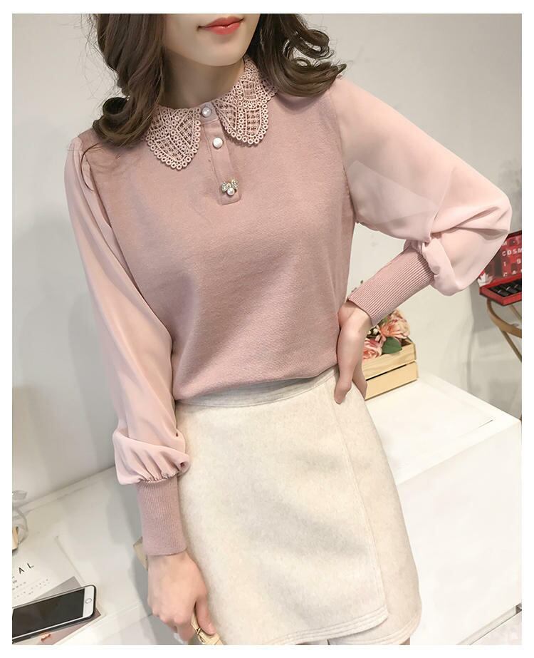 【送料無料】 ブラウス シフォン シースルー 襟レース 長袖 パールボタン チャーム付き フェミニン オフィス フォーマル TP-018NM