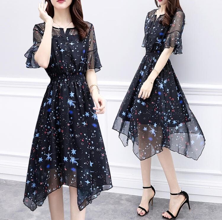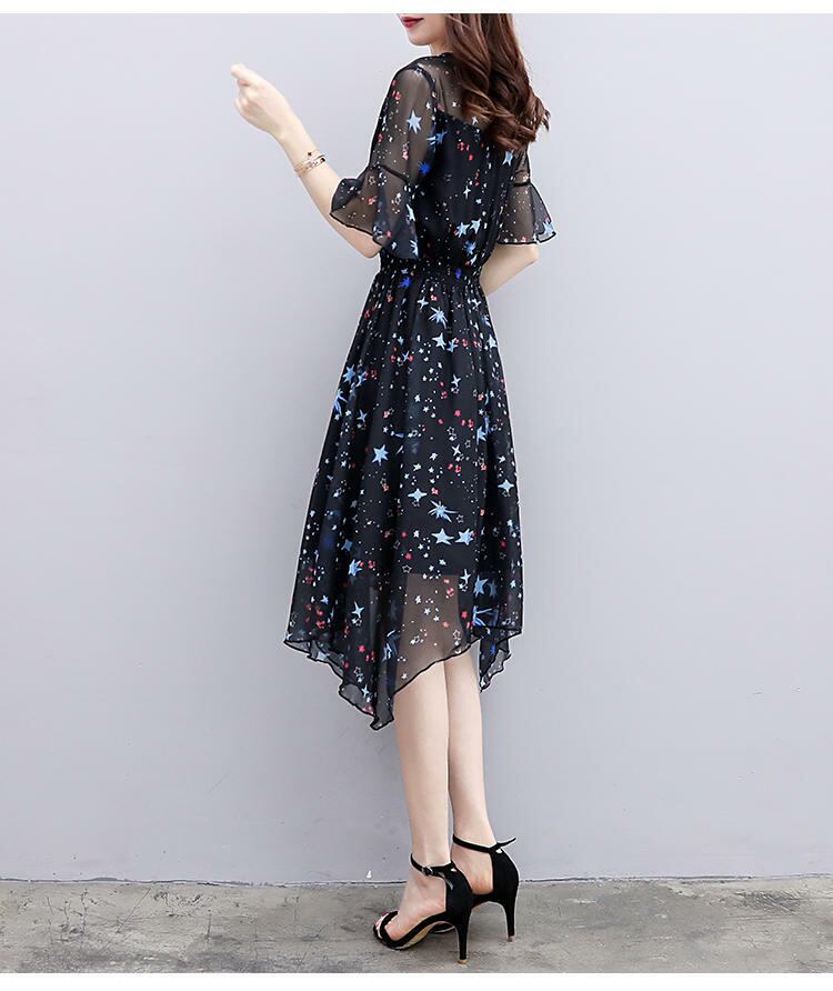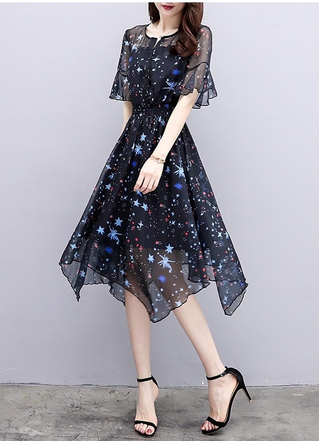 【送料無料】 シフォンワンピース 宇宙柄 星柄 シフォン ランダム裾 半袖 フェミニン 透け素材 ミモレ丈 ウエストゴム ハイウエスト OP-056NM