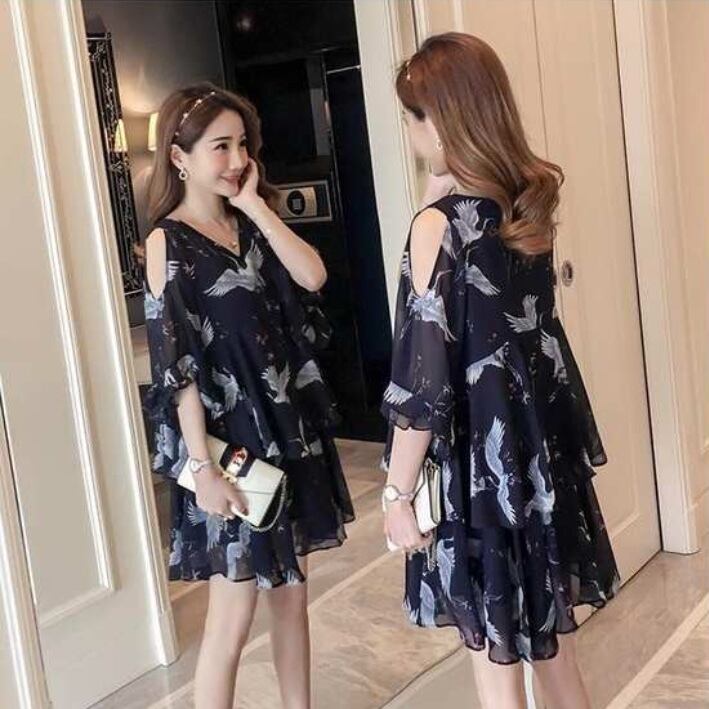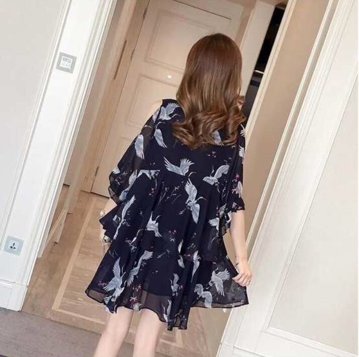 【送料無料】 シフォンワンピース ミニ丈 白鳥柄 肩出し 肩スリット Vネック フリル 七分袖 春 夏 OP-057NM