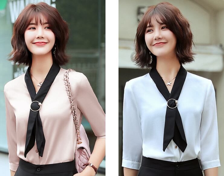 【送料無料】 シフォン ブラウス パール付リングバックル Vネックタイ 5分丈スリーブ フェミニン オフィス 通勤 普段使い シティー デート お出かけ シャンパンカラー ブラック ホワイト 全3色 TP-002KW