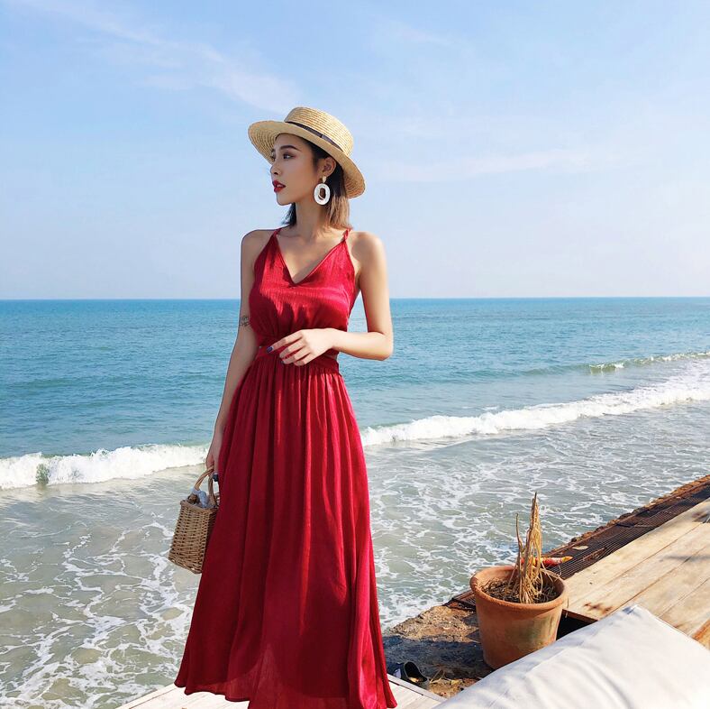 ワインレッドの光沢がゴージャスな楊柳サテン生地のサマードレスです♡ キャミ風ストラップはバックでクロスし、胸元は深めのVカット、ウエスト全面ではリボンがクロスしたような繋ぎになっています☆ このドレス1枚でセレブ感たっぷりのサマーバケーションを!!