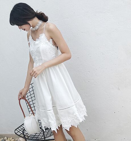 【送料無料】 可愛い ミディ丈 レトロ コットン サマードレス プリンセス風 ワンピース 花柄モチーフ カットワーク刺繍 清楚 ノースリーブ オープンバック クロスストラップ ウエストギャザー キュート フェミニン ホワイト ビーチ リゾート 旅行 デート DR-013KW
