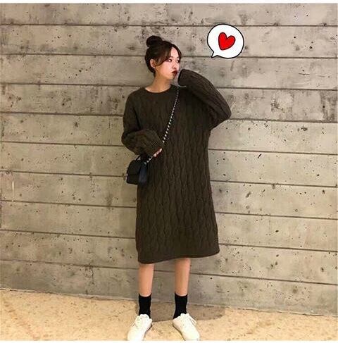 シンプルなミモレ丈ニットワンピース。ケーブルニットのざっくりした編み目にオーバーサイズのダボっと感が可愛い♪ウエストにベルトを締めて着るのもおすすめです☆