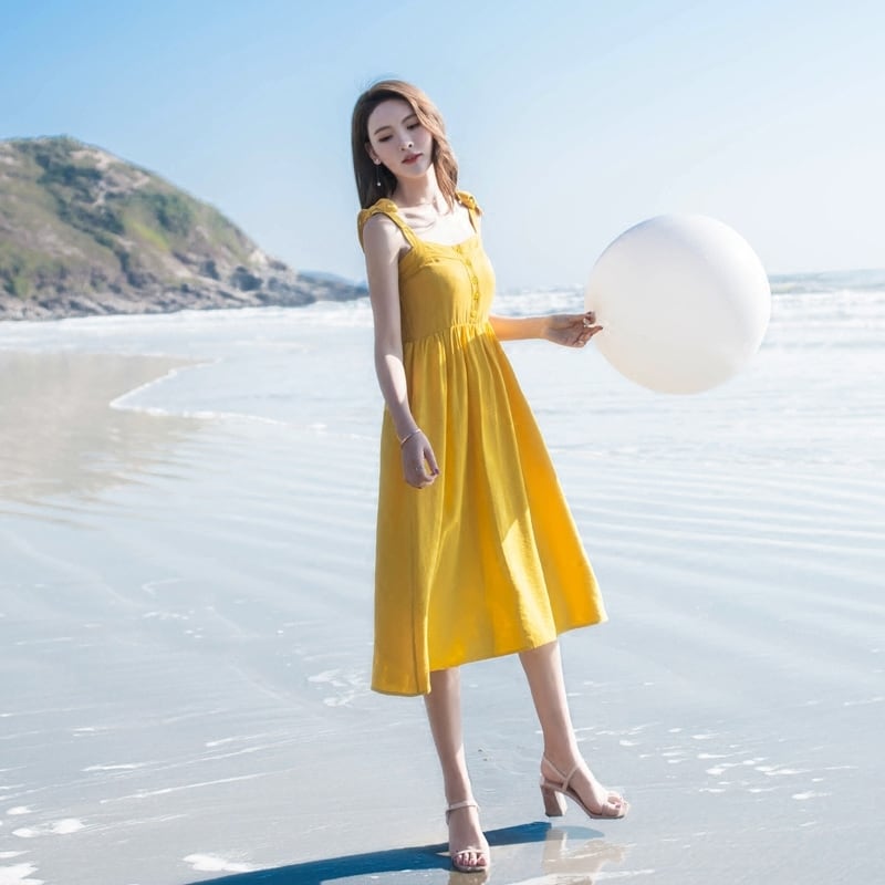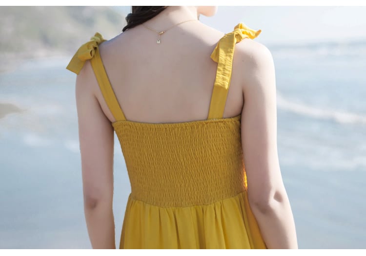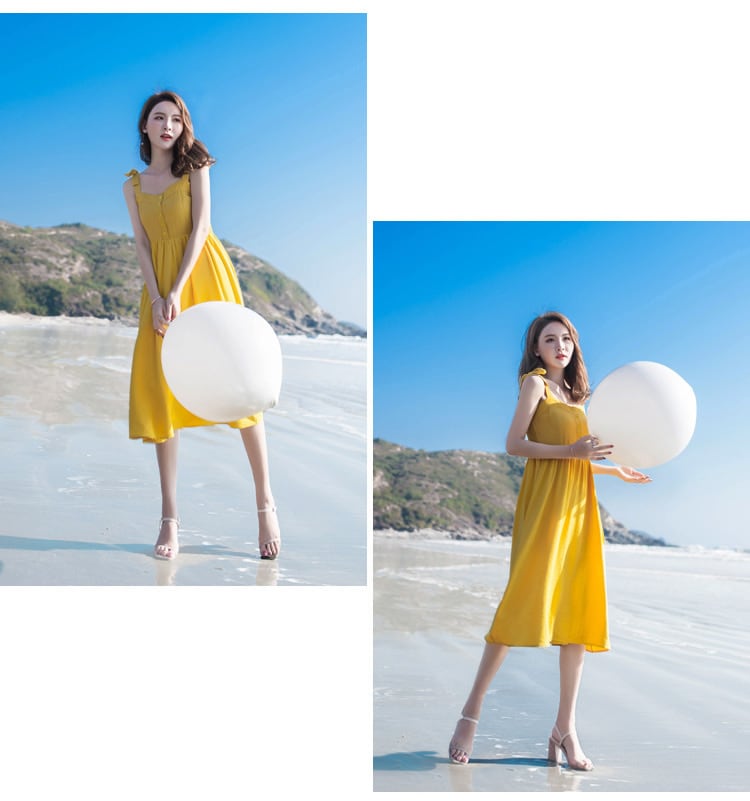 【送料無料】 ノースリーブワンピース ひざ丈 イエロー 黄色 ビスチェ ハイウエスト リボン ビーチドレス サマードレス 可愛い ガーリー レトロ お洒落 リゾート デート 女子会 デイリー 夏 OP-007HM