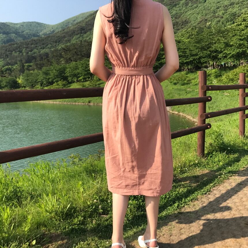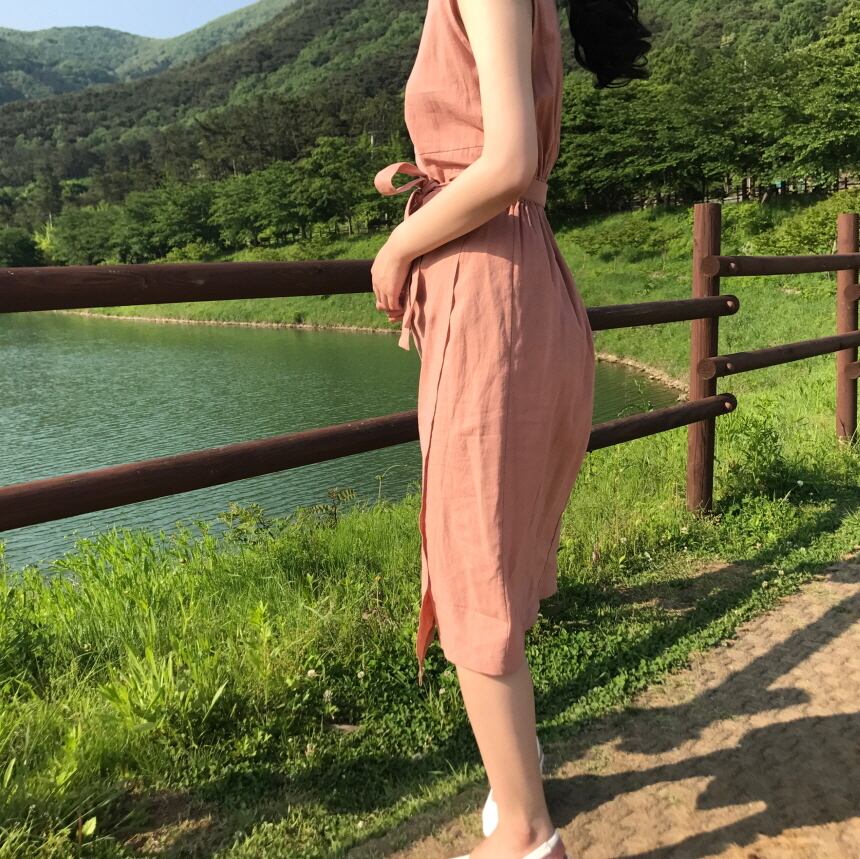 【送料無料】 ノースリーブワンピース ラウンドネック 巻きスカート ウエストリボン ナチュラル ミドル丈 上品 可愛い デイリー 夏 オレンジ OP-016HM