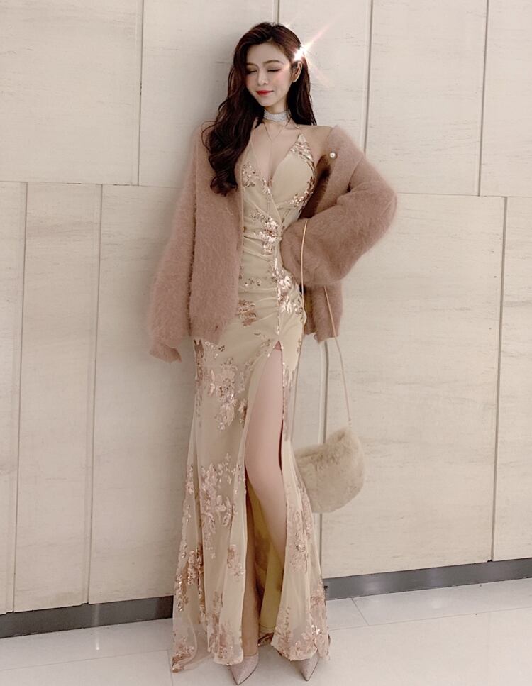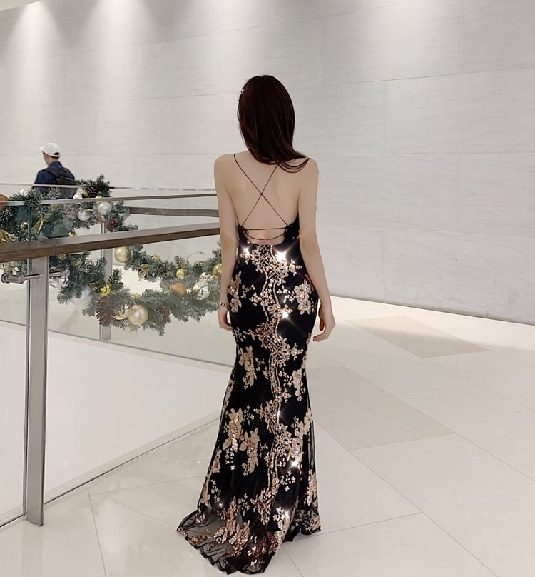 花柄スパンコールがゴージャスなパーティードレスです♪ロングシルエットにサイドスリットがセクシーなアイテム。キラキラのスパンコールが、人目を引く魅力たっぷりのドレスです☆
