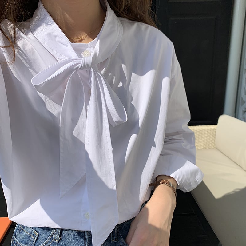 【送料無料】 ネックリボン ブラウス 長袖シャツ リボン 無地 ホワイト 白 水色 カジュアル 可愛い デイリー フェミニン 大人可愛い 通勤 通学 デート 女子会 お出かけ 着まわし SH-007HM