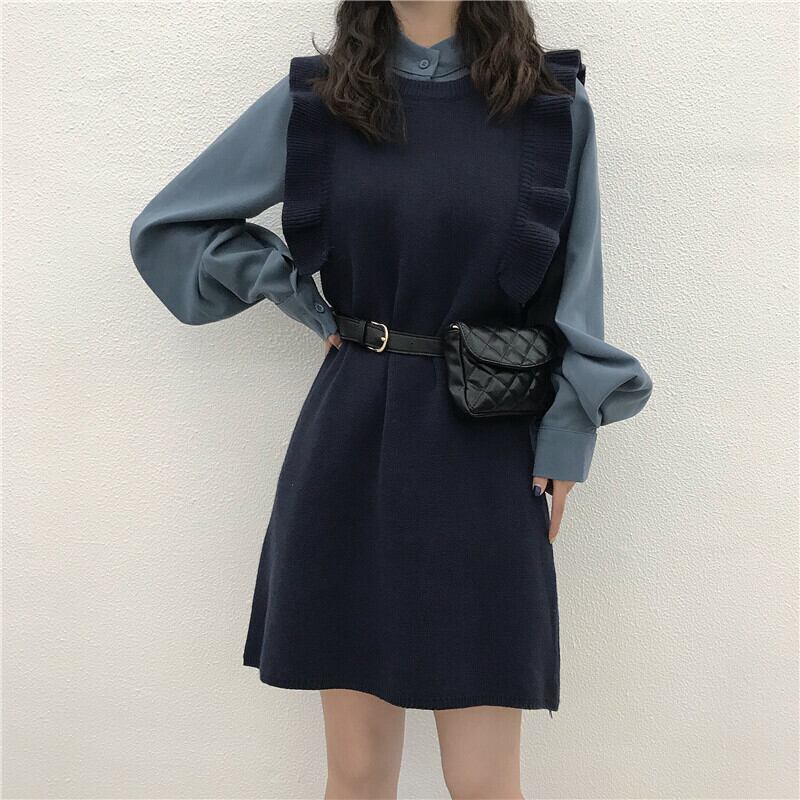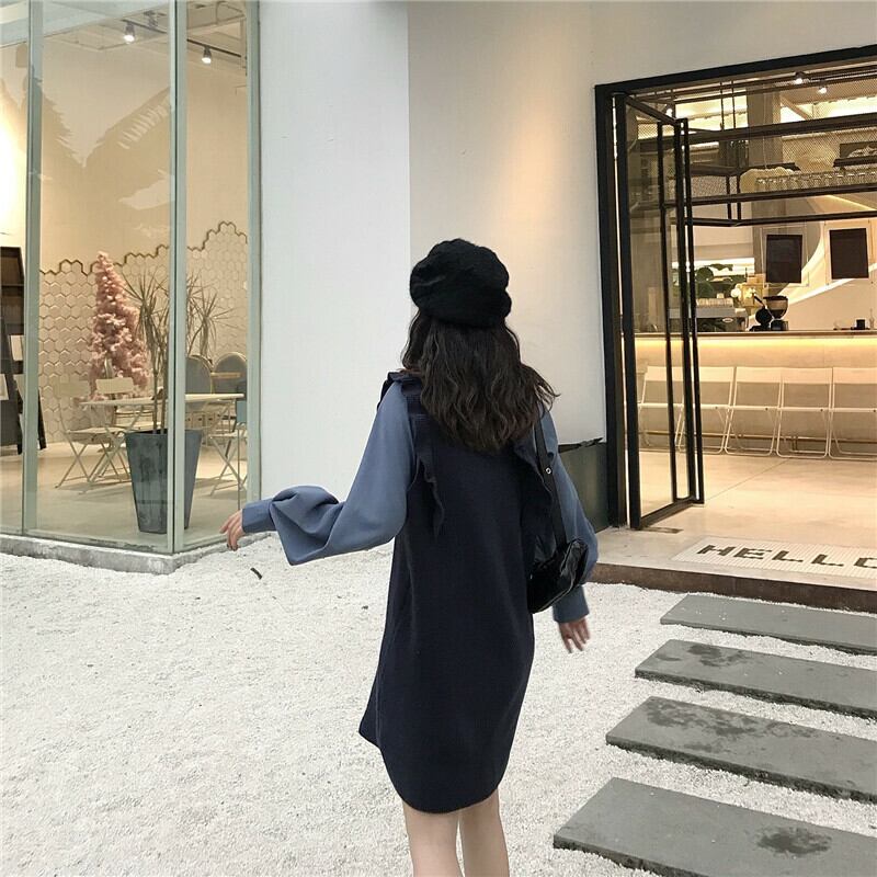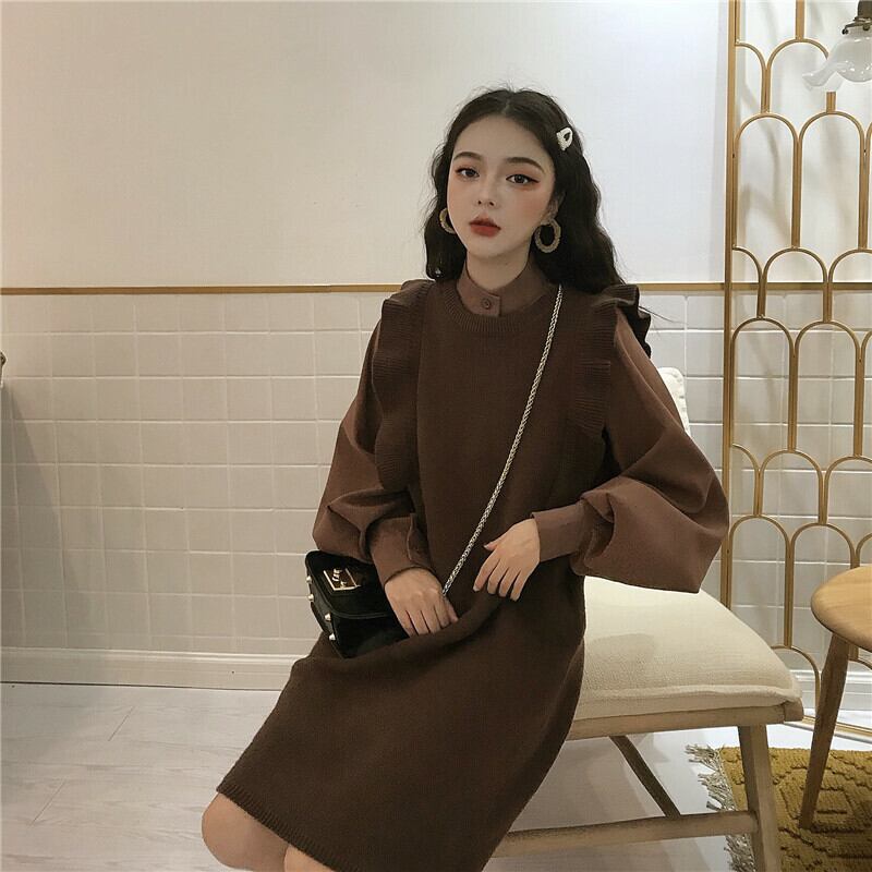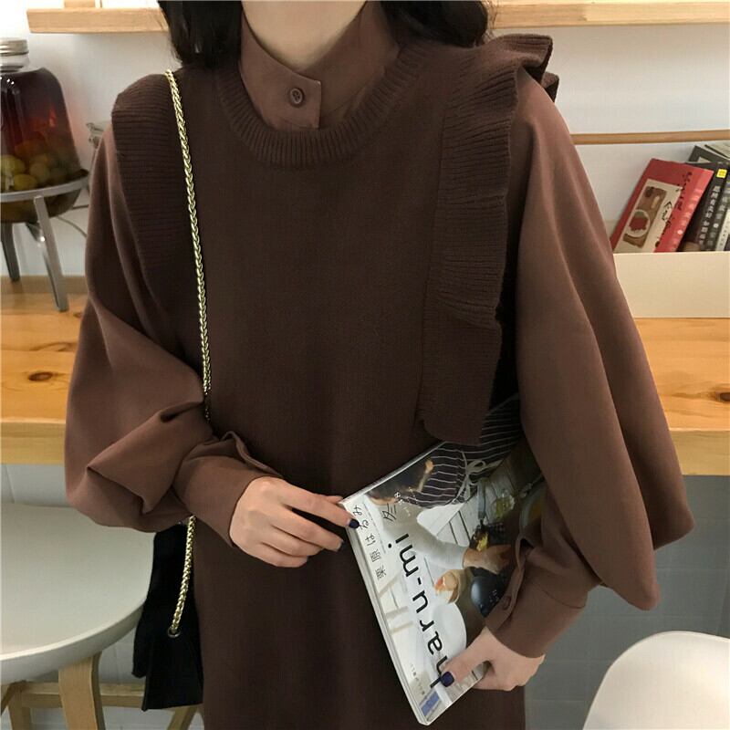 【送料無料】 フリルワンピース セットアップ 2点セット 長袖シフォンシャツ ニットワンピース バルーンスリーブ 袖コンシャス ドルマンシャツ ブラウス ハイネック レイヤード 重ね着 カジュアル 無地 可愛い デイリー フェミニン ガーリー オルチャン トレンド 着まわし ブルー ネイビー ブラウン 茶 ST-003HM