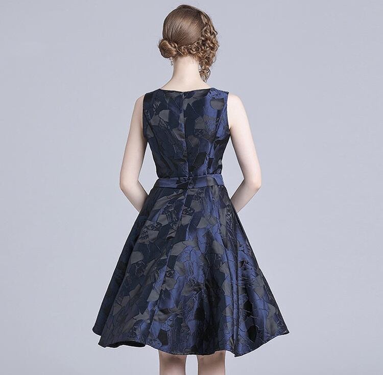 【送料無料】 ドレス ノースリーブ ウエストリボン Aライン 膝丈 バックファスナー フレア 花柄 エレガント 結婚式 二次会 パーティー お呼ばれ DR-012NM