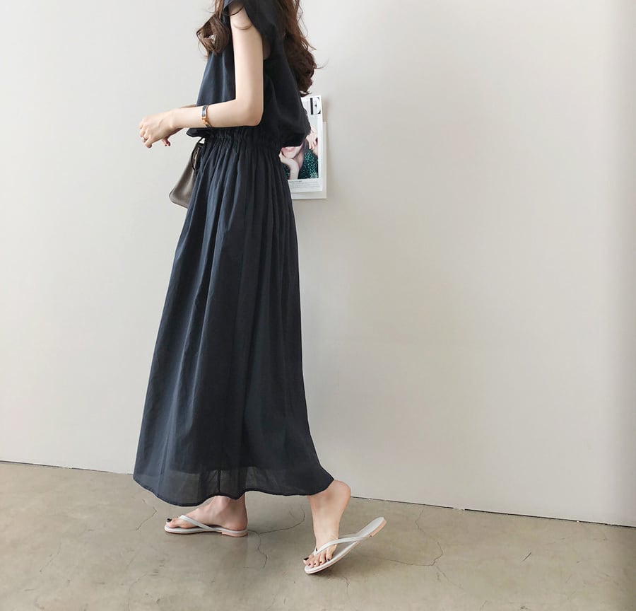 ウエストのタッセルがポイントのロングワンピースです♪大人可愛いふんわりとした印象の美Aラインシルエット♪シンプルで上品なデザインはデイリー使いからフォーマルシーンまで活躍してくれる、万能ワンピースです☆