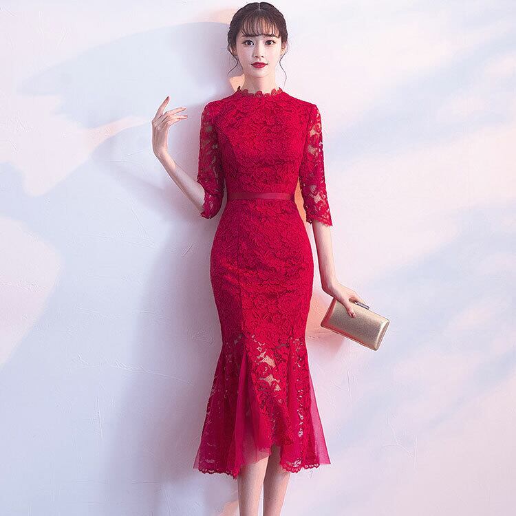 【送料無料】 ドレス 結婚式 スリム イブニングドレス セクシー 上品 刺繍 ハイウェスト レッド DR-001SN