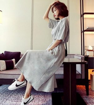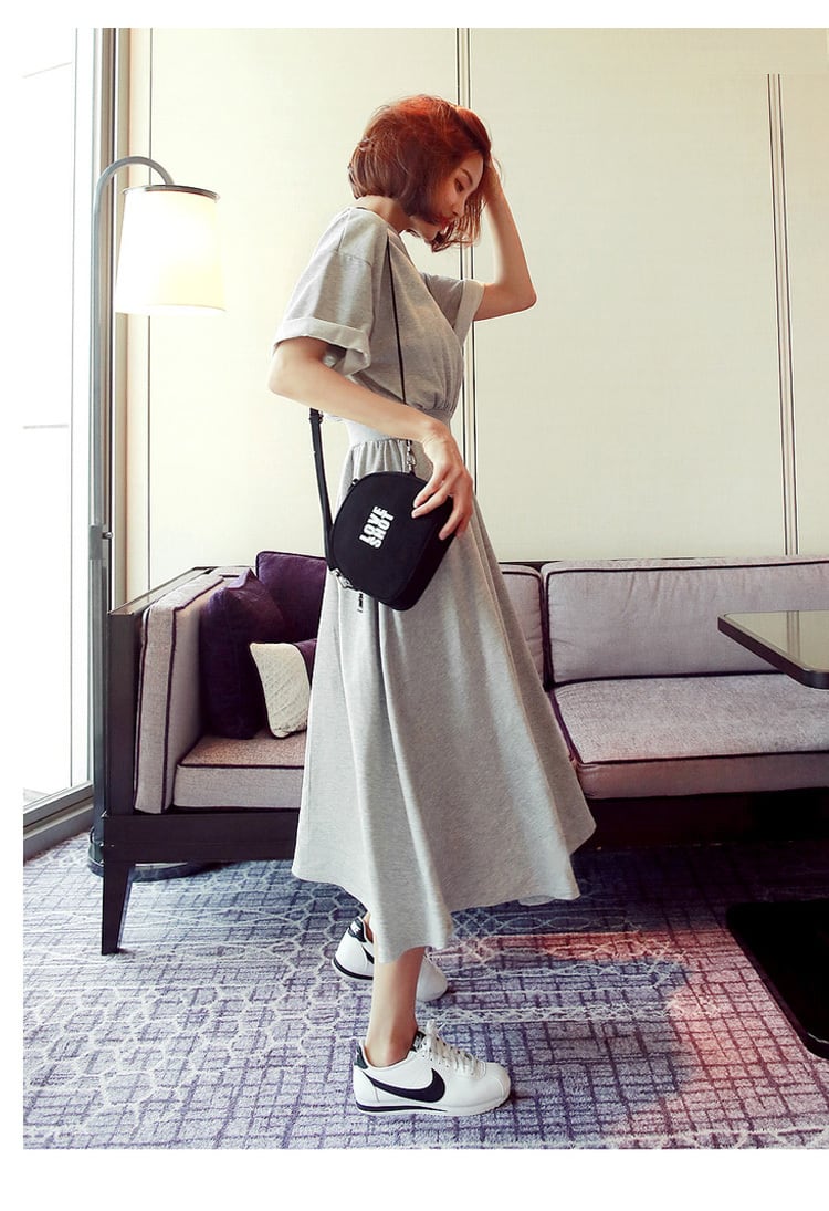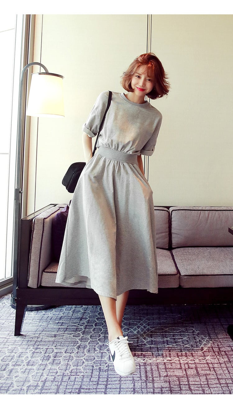 【送料無料】 Aライン ワンピース ロング丈 フレア コットン ハイウエスト ラウンドネック ドロップショルダー 抜け感 半袖 オルチャン 韓国 トレンド シンプル カジュアル らくちん 可愛い デイリー グレー ブラック 通勤 通学 夏 OP-050HM