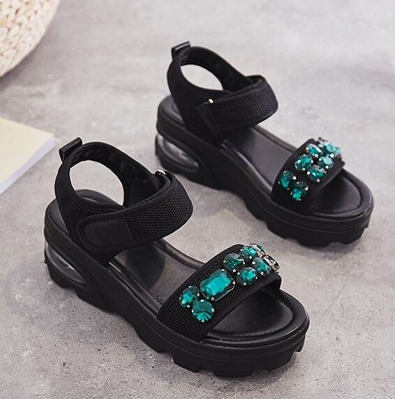 【送料無料】 2カラー ベルクロ ラインストーン 厚底 スポーツサンダル アンクルストラップ オープントゥ スポサン きらきら 美脚効果 脚長効果 6cmヒール フラット マジックテープ お洒落 普段使い きれいめ ゴージャス デイリー デート 女子会 カジュアル ブラック 黒 グリーン 夏 FW-017HM