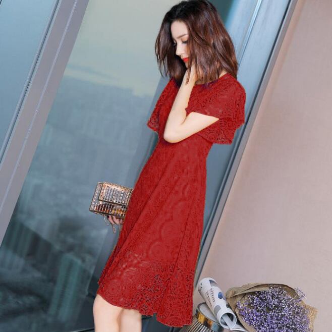 【送料無料】 選べる全4色 ライトブルー ヌードピンク イエロー レッド 総透かしレース フレアスリーブ ドレス ミディ丈 ラウンドネック エレガント フェミニン イブニング ディナー カクテル フォーマル 結婚式 二次会 パーティー DR-033KW