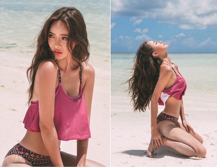 エスニック織物風のマルチカラーショーツが素敵なパープルフレアビキニです☆ トップスはチェストパッドも付いていて、ストラップは後ろで交差して安定感有り◎ 浅めのショーツがウエストのくびれやヒップをアピールしてとてもセクシー♡ 女性度抜群のビキニで夏の主役に♪