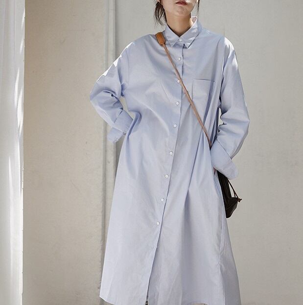【送料無料】 2カラー 長袖 シャツワンピース ロングシャツ ひざ下 ロング丈 オーバーサイズ ドロップショルダー ポケット付き 襟付き フロントボタン シンプル カジュアル ゆったり 体型カバー 可愛い 大人カジュアル 抜け感 お洒落 オルチャン 韓国 デイリー ブルー イエロー OP-052HM
