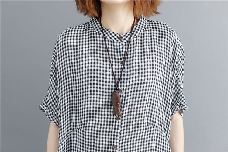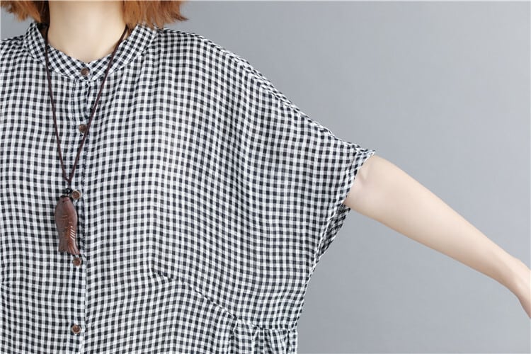 【送料無料】 チェック柄 半袖ワンピース シャツワンピース ロングシャツ ひざ下 ドルマン オーバーサイズ フロントボタン ドロップショルダー ノーカラー シンプル カジュアル ゆったり 体型カバー 可愛い 大人可愛い 抜け感 お洒落 オルチャン 韓国 デイリー 夏 OP-056HM