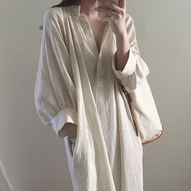 【送料無料】 Vネック カジュアル ロングワンピース Iライン ゆるシルエット ビッグシルエット 九分袖 お洒落 抜け感 スリット シンプル 無地 大人 オルチャン 韓国 デイリー ホワイト 白 ベージュ 春 夏 OP-070HM