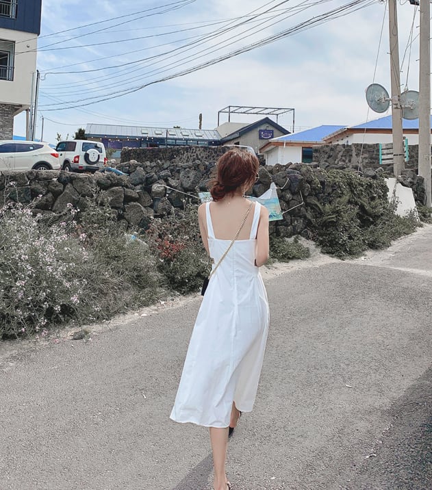 夏の暑さをコットン素材で涼しく過ごす、ストラップドレスです♡ シンプルカラーのブラックとホワイトに前面にステッチで模様を入れた上品なドレス☆ 胸元はスクエアネック、ウエストの両脇はゴムでゆったり開放感があります◎ ビーチやリゾートにぴったりな一枚です☆