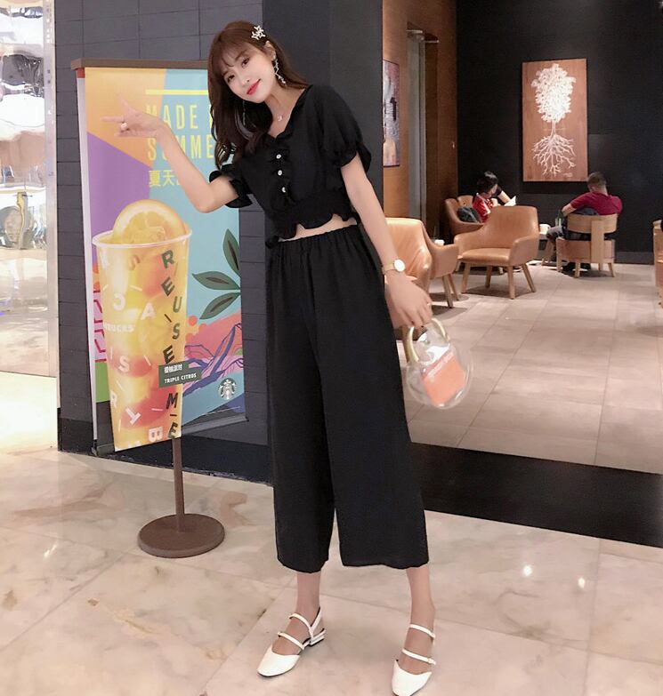 【送料無料】 スイート 可愛い 前ボタン フリルトップス ワイドレッグパンツ セットアップ フェミニン キュート エレガント クロップドパンツ ツーピース ブッファンスリーブ ウエストゴム アプリコット ブラック 全2色 オフィス 通勤 通学 デート お出かけ お呼ばれ シティー デイリー 普段使い タウン ST-009KW