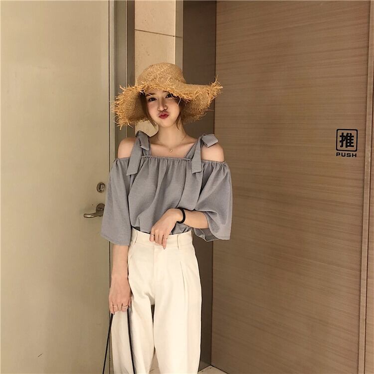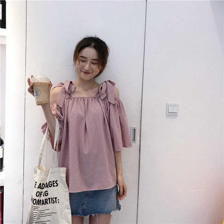 【送料無料】 オフショルダー リボン ショルダーストラップ オープンショルダー トップス 半袖 五分袖 ワイド袖 体型カバー ビッグシルエット 可愛い 抜け感 オルチャン 韓国 デイリー ホワイト ピンク ライトブルー 夏 TP-031HM