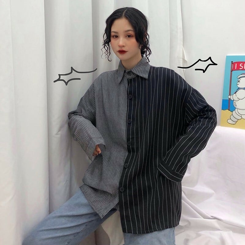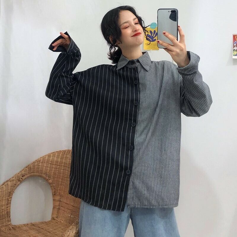 【送料無料】 バイカラー ストライプ 長袖シャツ ビッグシルエット ワイドシルエット ドロップショルダー フロントボタン 襟付き メンズライク トップス クール カジュアル おしゃれ 抜け感 デイリー ブラック 黒 春 秋 SH-014HM