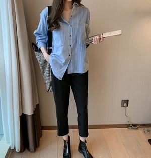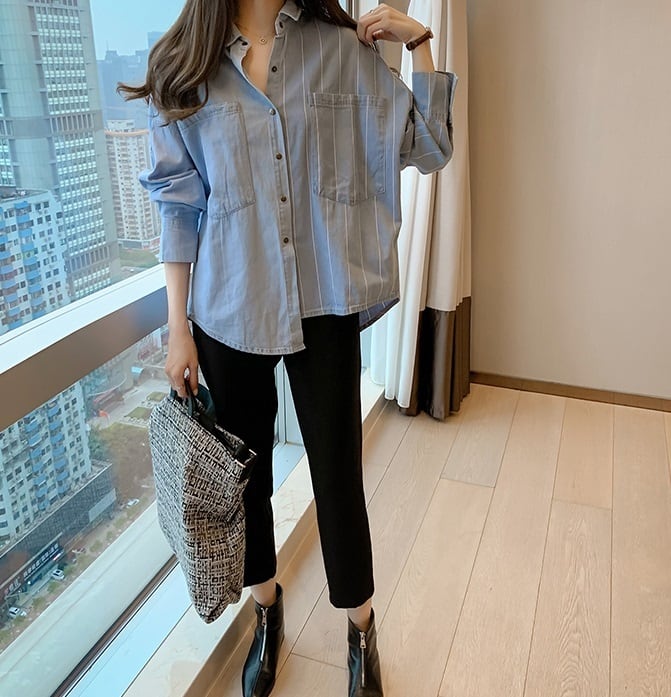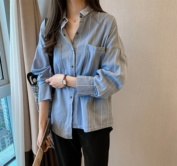 【送料無料】 ストライプ 長袖 デニムシャツ アシンメトリー バックシャン フロントボタン バックボタン 襟付き トップス ドロップショルダー オーバーサイズ ビッグシルエット ワイドシルエット カジュアル おしゃれ ポケット 抜け感 デイリー ブルー 春 秋 SH-022HM