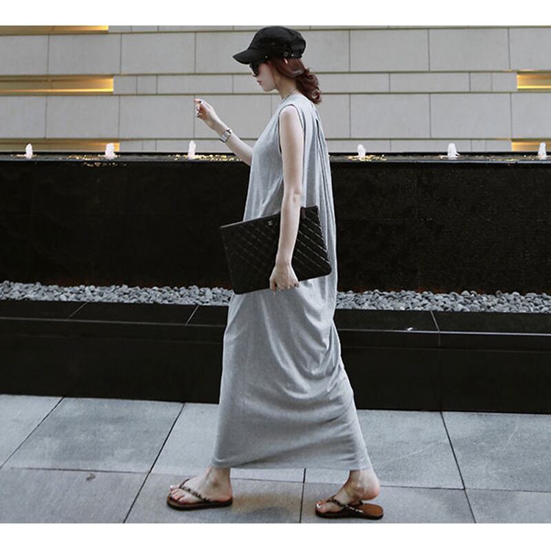 【送料無料】 ノースリーブ マキシワンピース ラウンドネック らくちん バックシャン ロング丈 カジュアルセレカジ 無地 オルチャン 韓国 トレンド シンプル らくちん 着まわし デイリー ブラック グレー 黒 灰色 春 夏 秋 OP-083HM