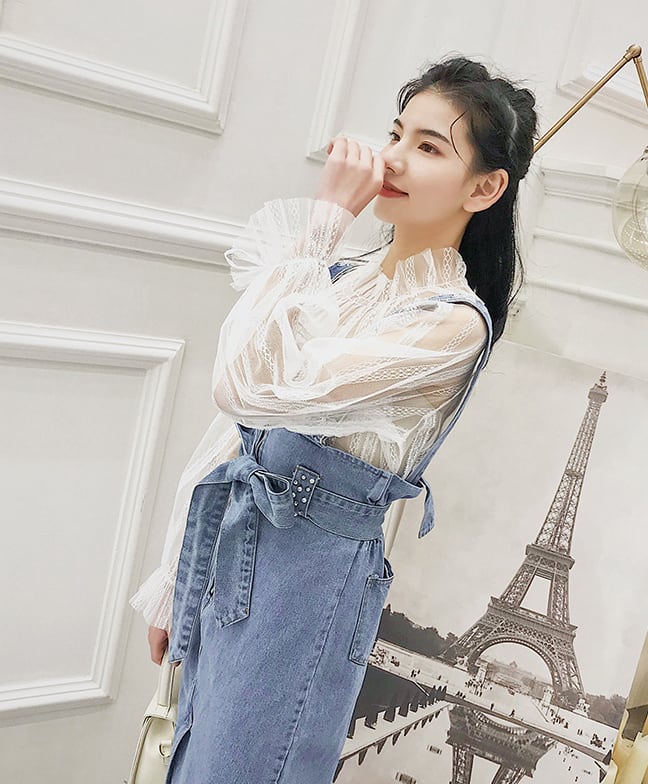 【送料無料】 可愛い ビーズデコレーション 前スリット入り ブルー デニム ミディ丈 ジャンパースカート サロペット コットン100% オーバーオール フロントジッパー ウエストリボン ノースリーブ ミディ丈 キュート フェミニン スレンダー お出かけ デート 通学 リゾート 旅行 デイリー 普段使い AI-013KW