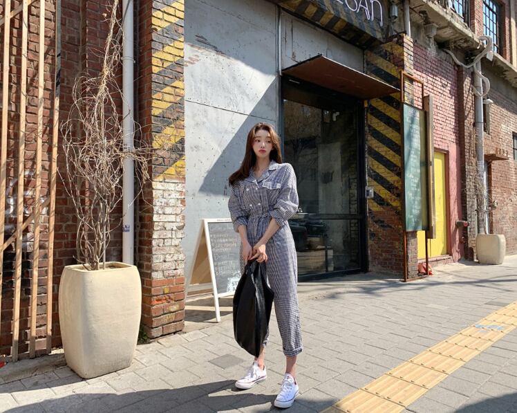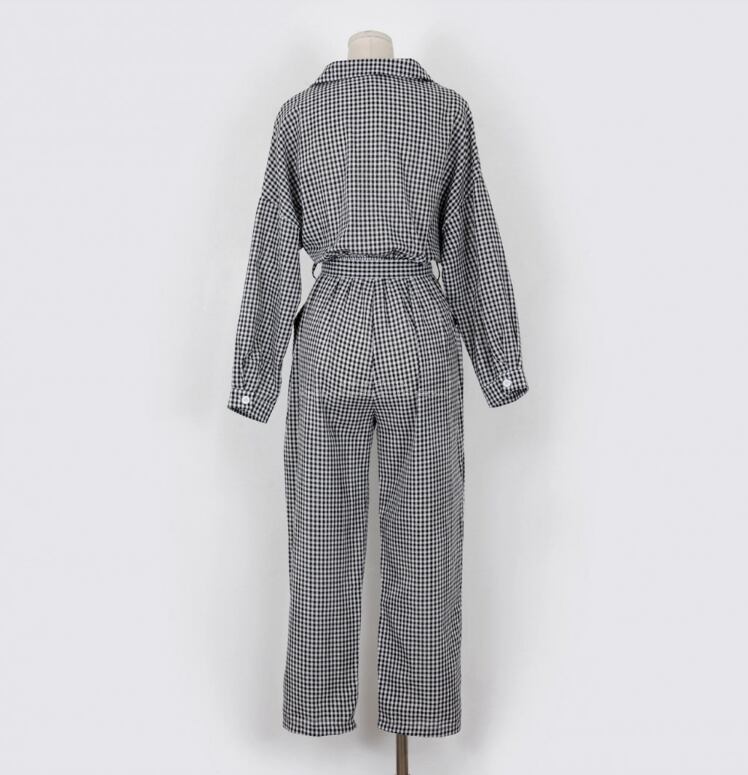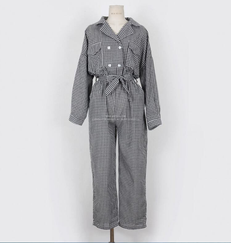 【送料無料】 ブラックギンガムチェック ダブルブレスト 長袖 オールインワン ウエストリボン パンツ 胸ポケット フラップポケット 通学 タウン お出かけ お買い物 デート レジャー デイリー 普段使い AI-015KW