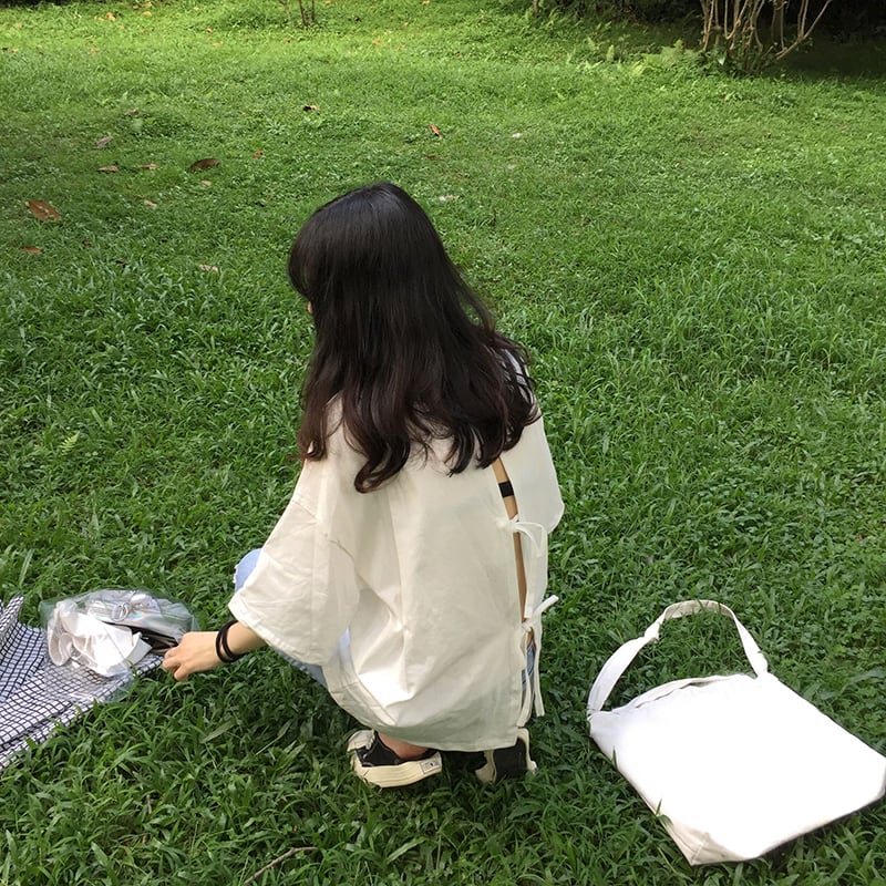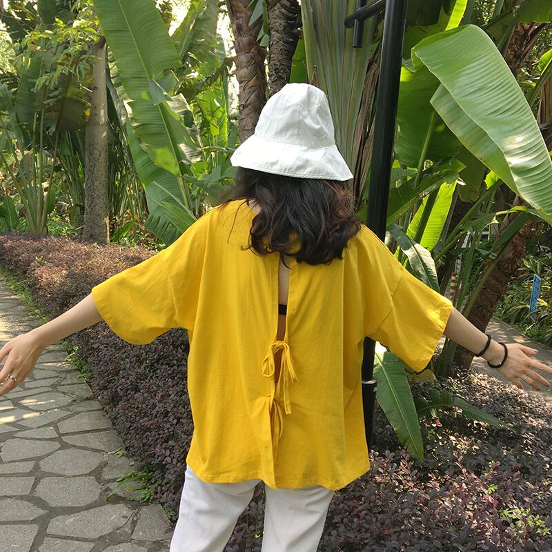 【送料無料】 全5色 ワイドシルエット 五分袖 トップス リボン バックシャン ビッグシルエット ドロップショルダー 半袖 お洒落 女子会 デート オルチャン 韓国 ホワイト パープル グリーン イエロー ブラック 白 黒 夏 TP-046HM