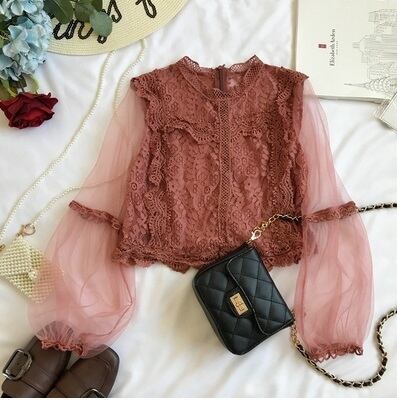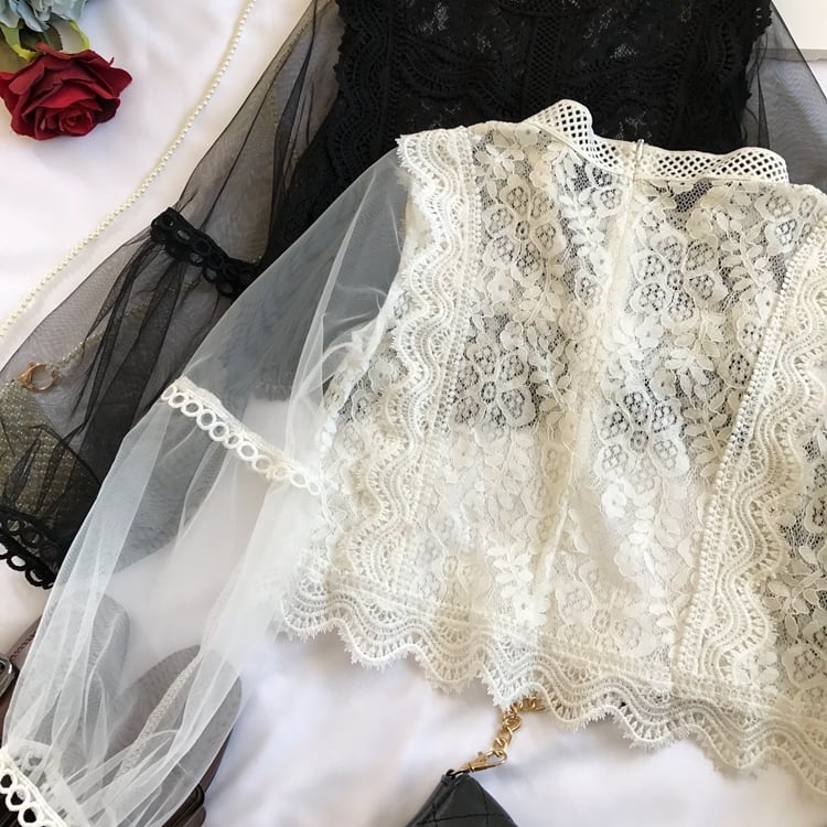 【送料無料】 全8色 花柄レース シースルー ブラウス トップス バルーンスリーブ パフスリーブ 透け感 袖コンシャス セクシー ショート丈 お洒落 女子会 デート オルチャン 韓国 ブラック ホワイト 白 黒 春 夏 秋 TP-048HM