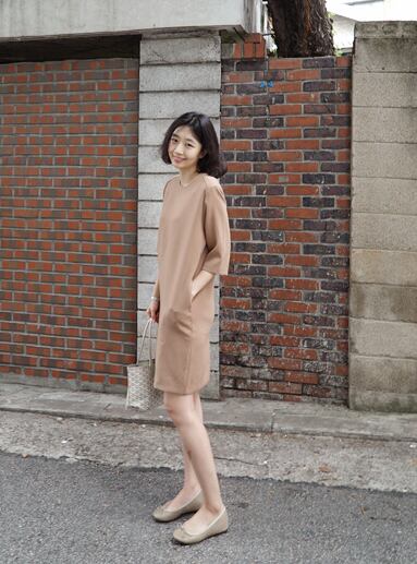 【送料無料】 韓国 ゆるシルエット シンプル 大人カジュアル クロエポケット ワンピース 膝上丈 ラウンドネック 五分袖 ブラック カーキ カジュアル 普段使い シティー デート お出かけ デイリー DR-043KW