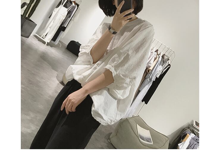 【送料無料】 全5色 リネン ブラウス 七分袖 フロントボタン オーバーサイズ バルーンスリーブ ボリューム袖 麻 ラウンドネック パフスリーブ ワイド袖 ワイドスリーブ シャツ シンプル ゆるシルエット ゆったり 可愛い 大人カジュアル トレンド 韓国 オルチャン デイリー ブラック ホワイト イエロー ライトブルー ピンク 春 夏 秋 TP-057HM
