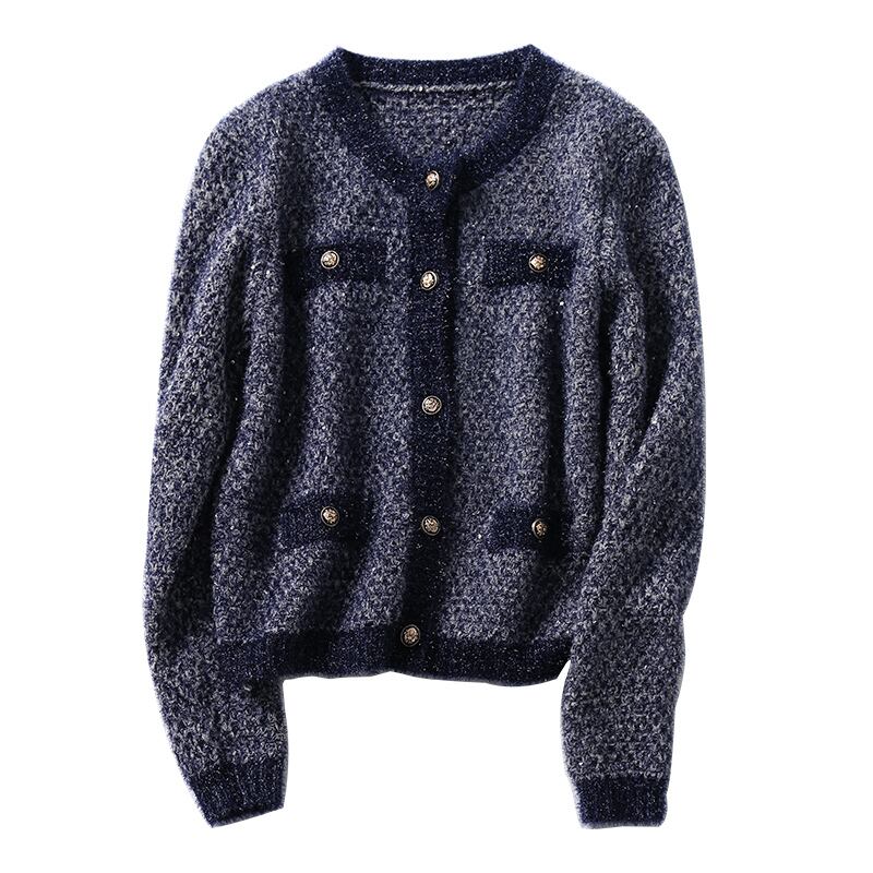 【送料無料】 セレブスタイル ブライトシルク スパンコール ニット カーディガン シングルブレスト ネイビー 華やか キラキラ パーティー
