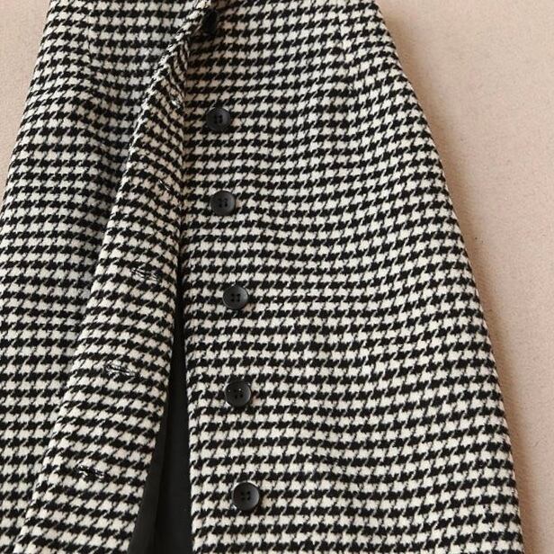 手触りの良いウール風仕立て生地の適度な厚さ、千鳥のステッチ、ボタンの装飾もある秋冬のスカートです。